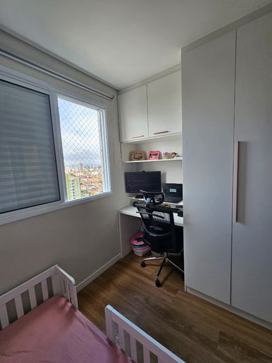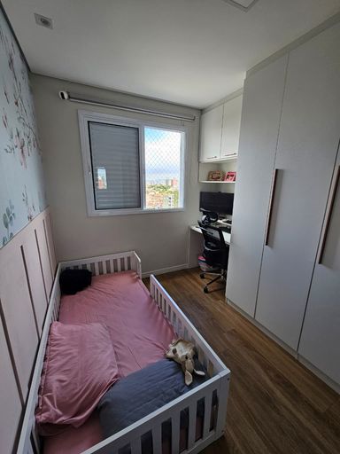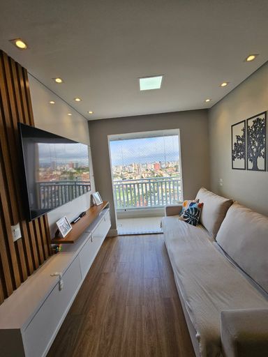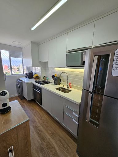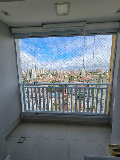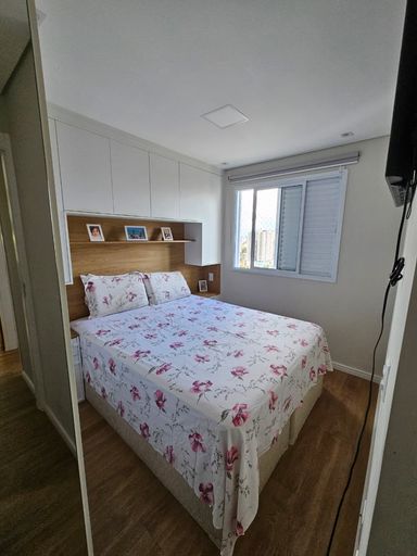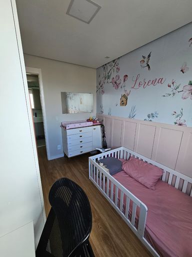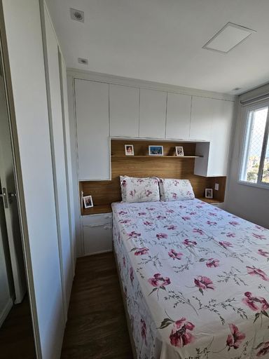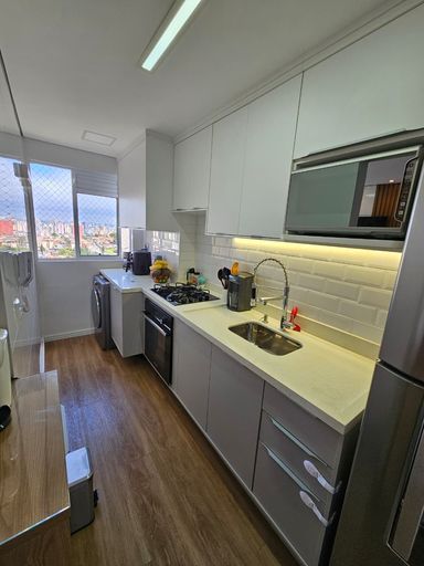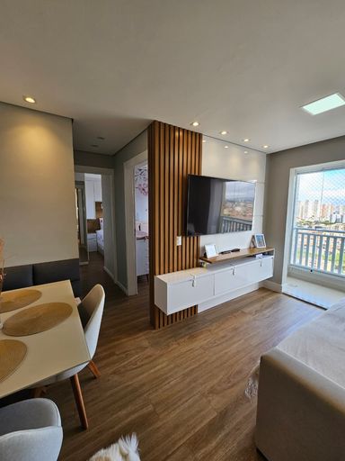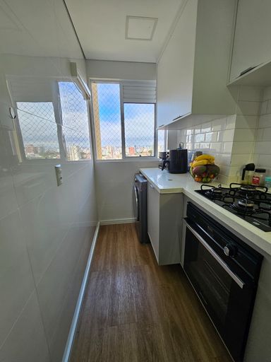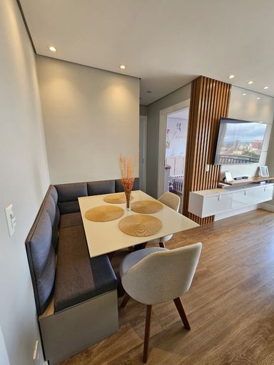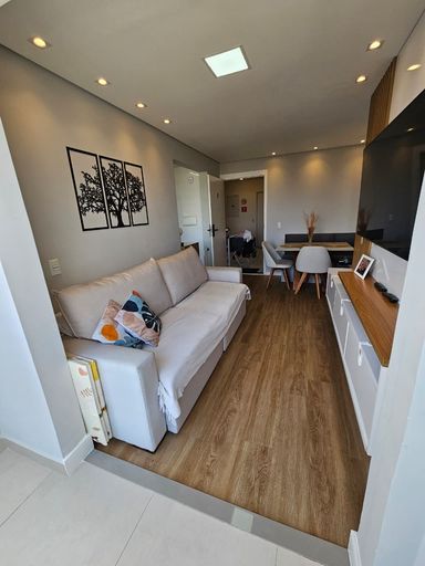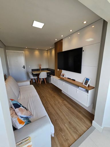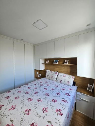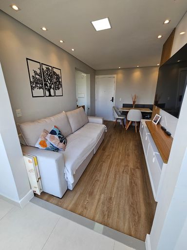 Apartamento com 47m² de área construída, 2 dormitórios, sala para 2 ambientes integrada a varanda, fechamento de vidro, vista livre, andar alto, cozinha com armários planejados, piso vinílico, móveis planejados em todos os ambientes e 1 vaga de garagem.