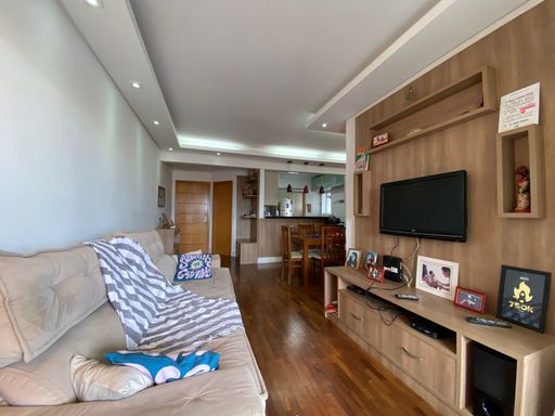 Apartamento com 69m² de área construída, 2 dormitórios sendo 1 suíte, sala com living ampliado, sofá, cozinha com armários planejados, equipada com eletrodomésticos, varanda, piso laminado e 2 vagas de garagem cobertas.