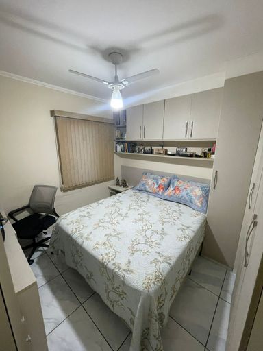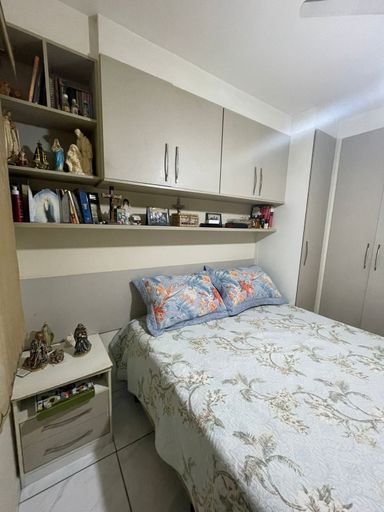 Apartamento com 51m² de área construída, sala para 2 ambientes, cozinha ampla com armários, 2 dormitórios com armários planejados, piso porcelanato e 1 vaga de garagem coberta.