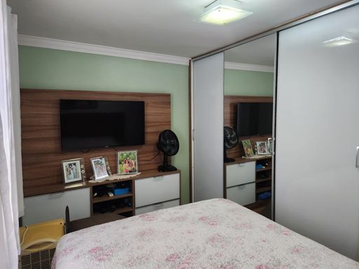 Apartamento com 55m² de área construída, sala para 2 ambientes, piso porcelanato, cozinha com armários, banheiro social, 2 dormitórios, móveis planejados e 2 vagas sendo 1 coberta.
