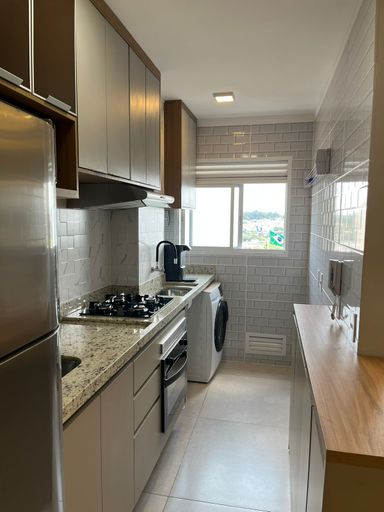 Apartamento com 48m² de área construída, 2 dormitórios, sala para 2 ambientes, cozinha americana, móveis planejados, piso porcelanato, banheiro social e 1 vaga de garagem.