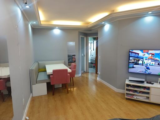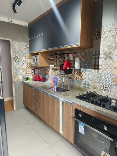 Apartamento com 78m² de área construída, 3 dormitórios sendo 1 com sacada, sala para 2 ambientes, cozinha ampla com armários, piso laminado na sala e dormitórios, piso porcelanato nas áreas frias, móveis planejados em todos os ambientes e 2 vagas de garagem.