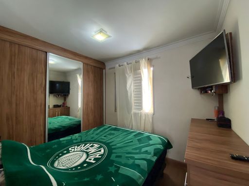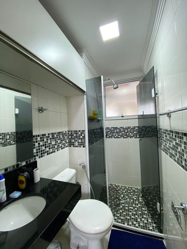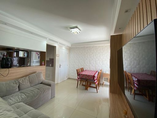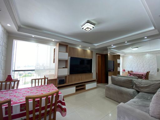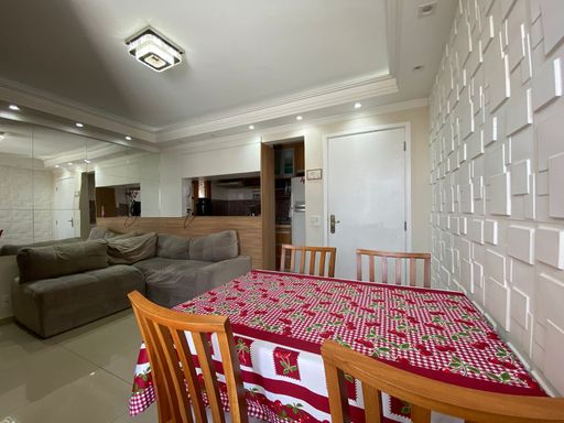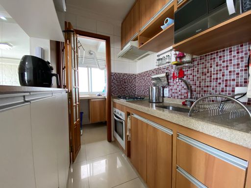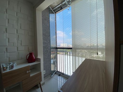 Apartamento com 48m² de área construída, 2 dormitórios com armários planejados, piso laminado nos dormitórios, sala para 2 ambientes integrada a varanda com fechamento de vidro, andar alto, vista livre, painel de televisão, mesa de jantar, sofá e espelho, cozinha americana com armários planejados, cooktop e forno elétrico, piso porcelanato nas áreas frias, área de serviço, aquecedor a gás e 1 vaga de garagem.