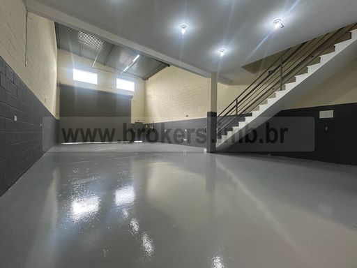 Galpão com 170 m² de área construída, pé direito de com 7m de altura, mezanino com banheiro, 2 banheiros no térreo sendo 1 PNE,. piso com pintura epóxi, porta automatiza.