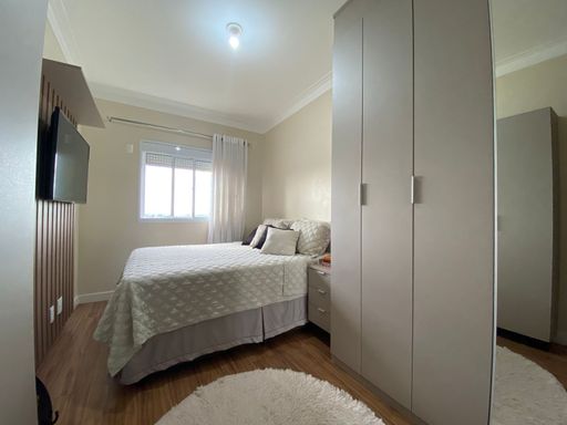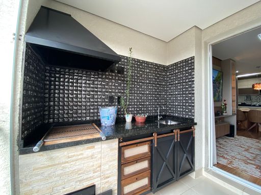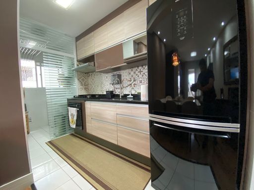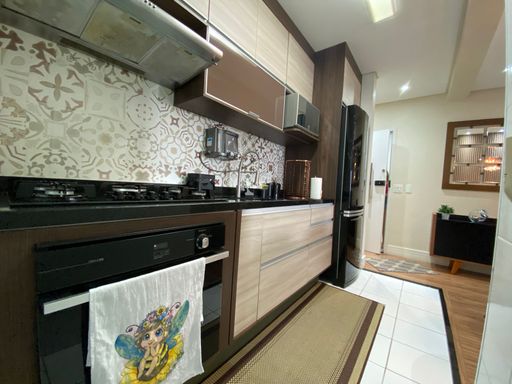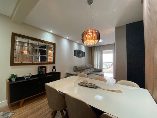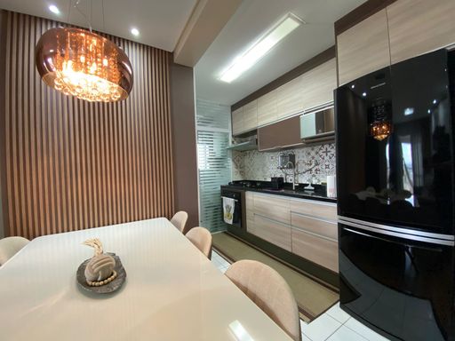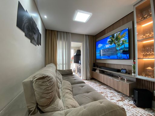 Apartamento com 70m² de área construída, 2 dormitórios sendo 1 suíte, piso laminado na sala e dormitórios, sala para 2 ambientes, varanda gourmet com churrasqueira a carvão, cozinha americana, móveis planejados em todos os ambientes, aquecedor a gás e 1 vaga de garagem coberta.