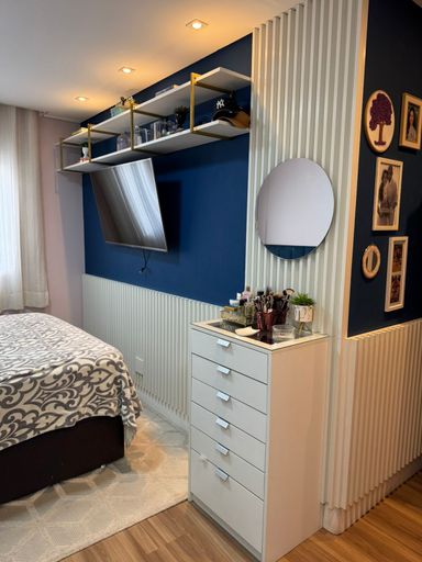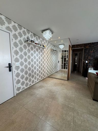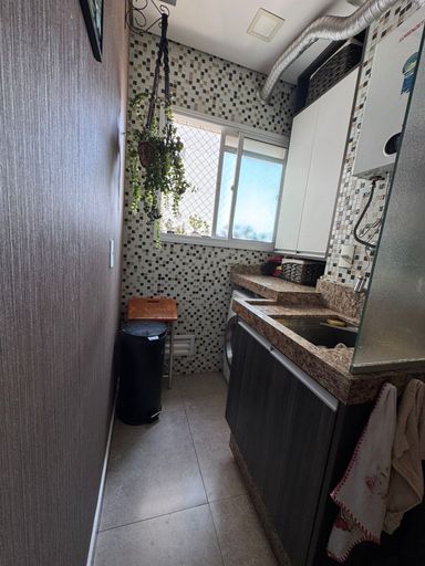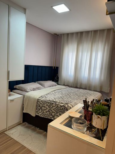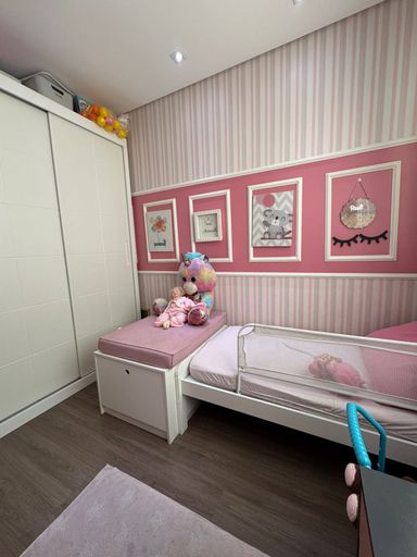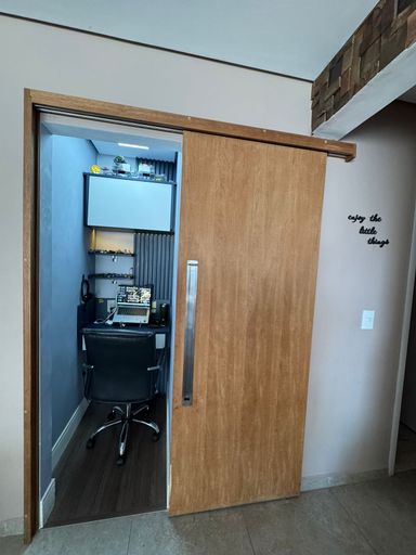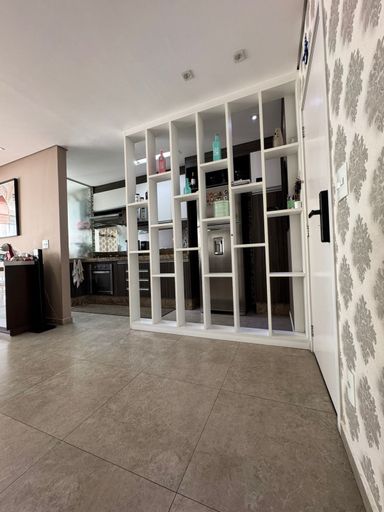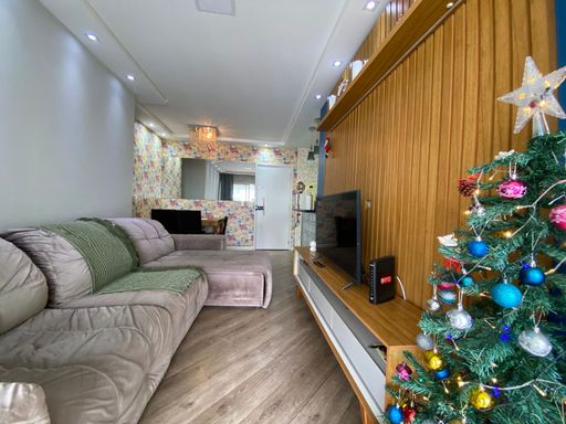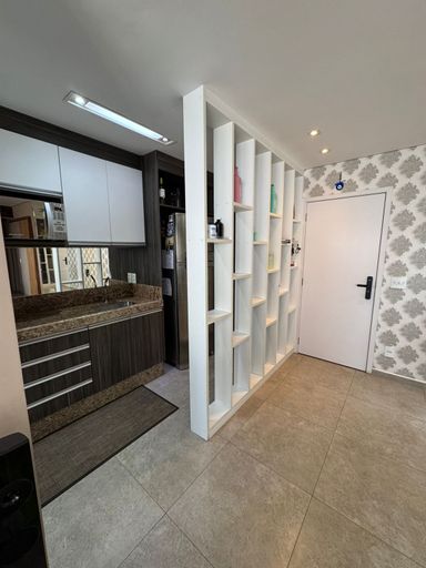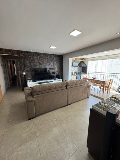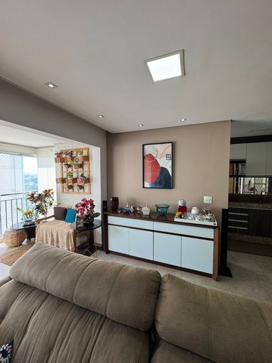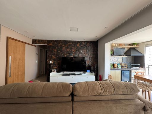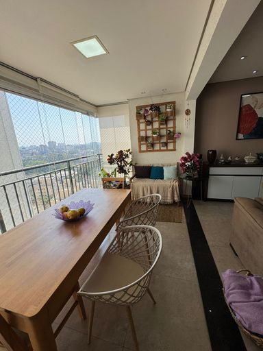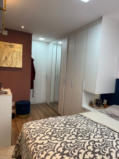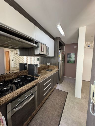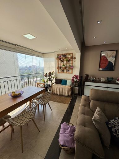Apartamento com 82m² de área construída, sala ampliada integrada a varanda gourmet, churrasqueira a carvão, fechamento de vidro na varanda, andar alto, cozinha americana, piso porcelanato na sala, banheiros e cozinha, móveis planejados em todos os ambientes, escritório, 2 dormitórios sendo 1 suíte, piso laminado nos dormitórios e 2 vagas de garagem coberta.